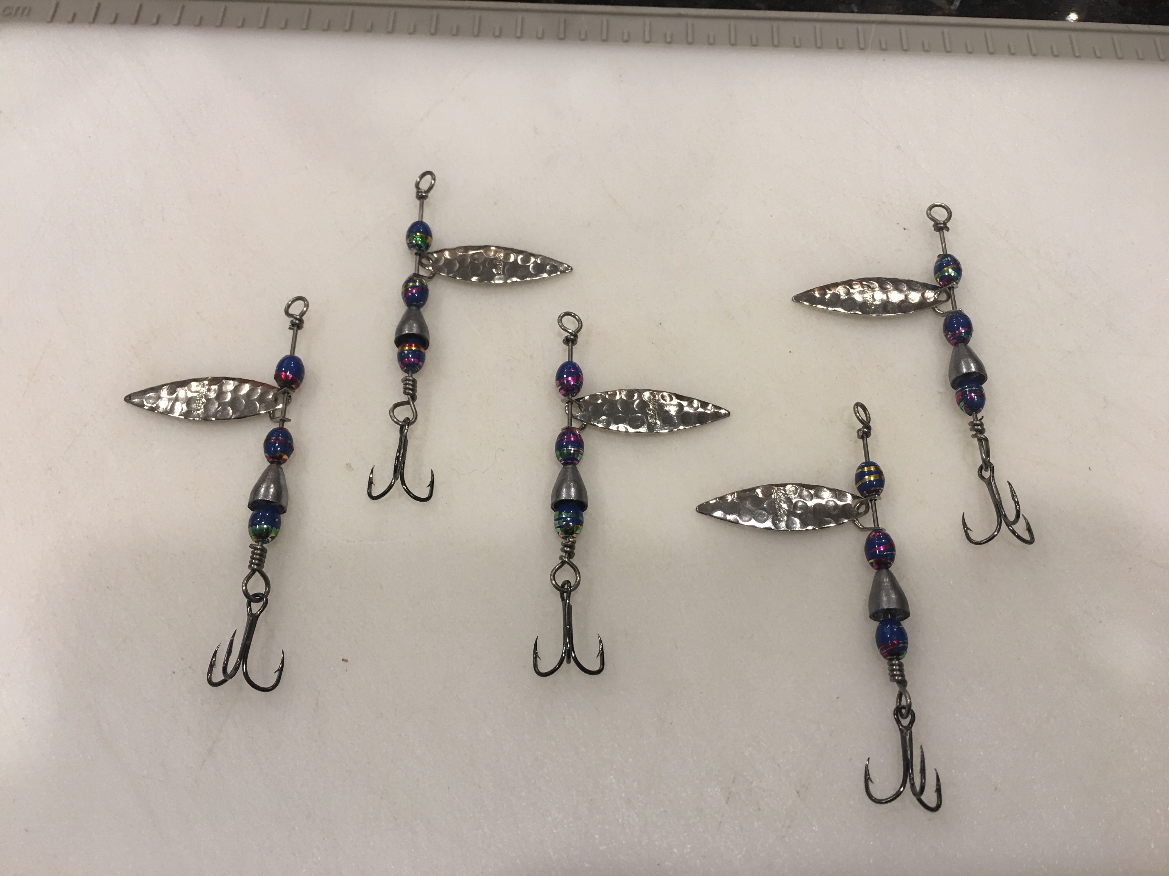 (4 pack) in-line spinner baits .035 wire #10 treble hook #3 hammered willow blade 1/16 oz. bullet weight confetti beads